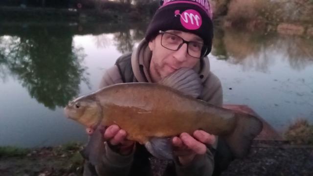 Robin Rogers, caught a tench at Hicks Farm today, did not know there were tench in the lake